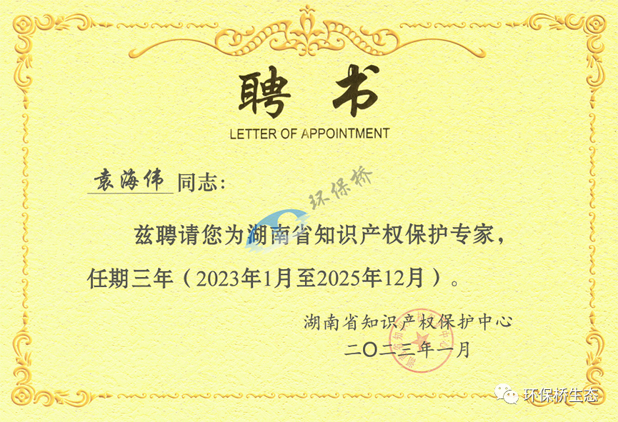 环保桥总经理袁海伟获聘湖南省知识产权保护专家,成为五名专业技术类专家组中的一员。