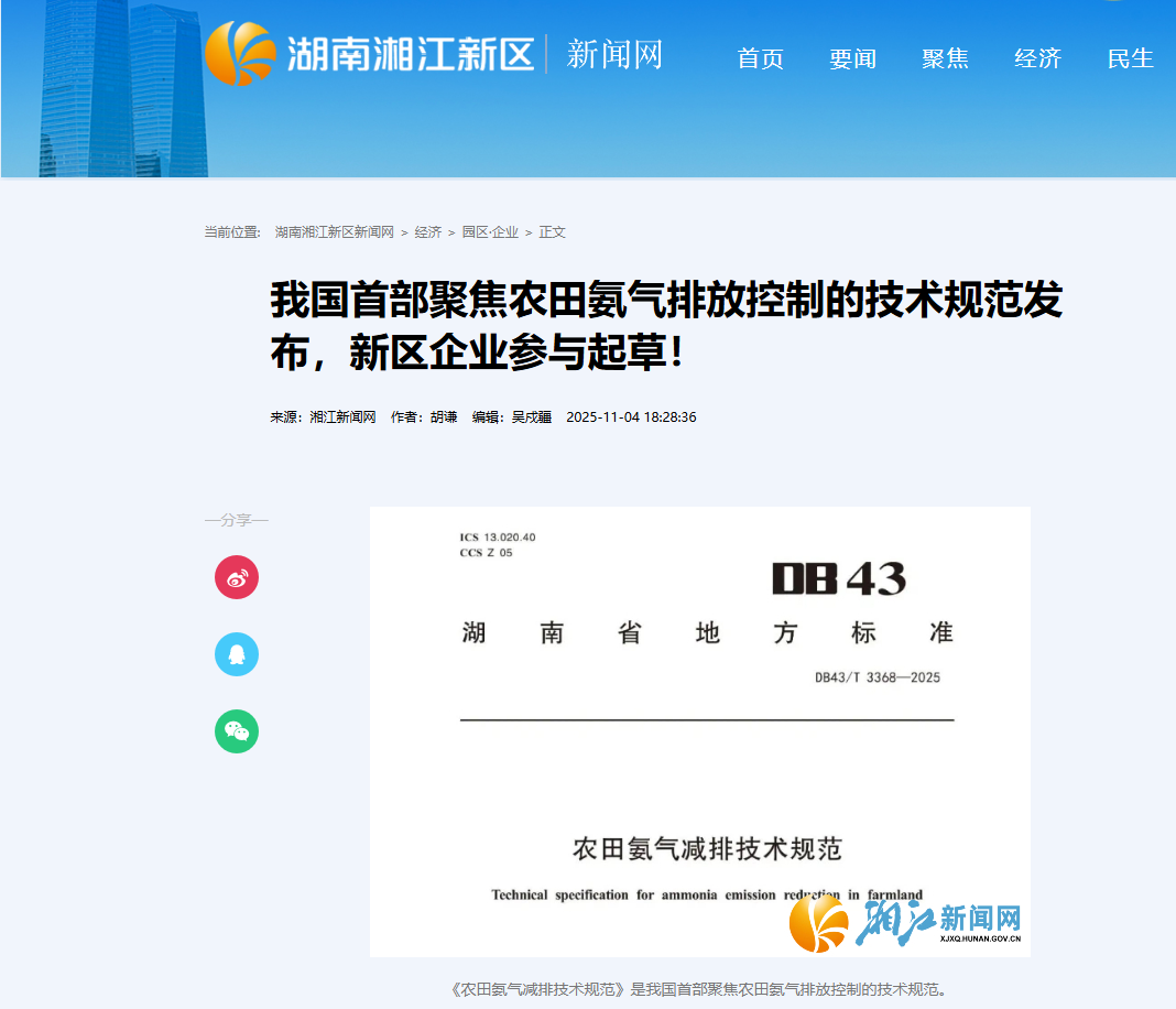 湘江新闻网11月4日讯(湘江融媒记者 胡谦)近日,省生态环境厅、省农业农村厅与省市场监督管理局联合制定并发布了《农田氨气减排技术规范》(DB43/T3368-2025)(以下简称《标准》)。这是我国首部聚焦农田氨气排放控制的技术规范,来自湖南湘江新区的环保桥(湖南)生态环境工程股份有限公司参与了标准的起草。