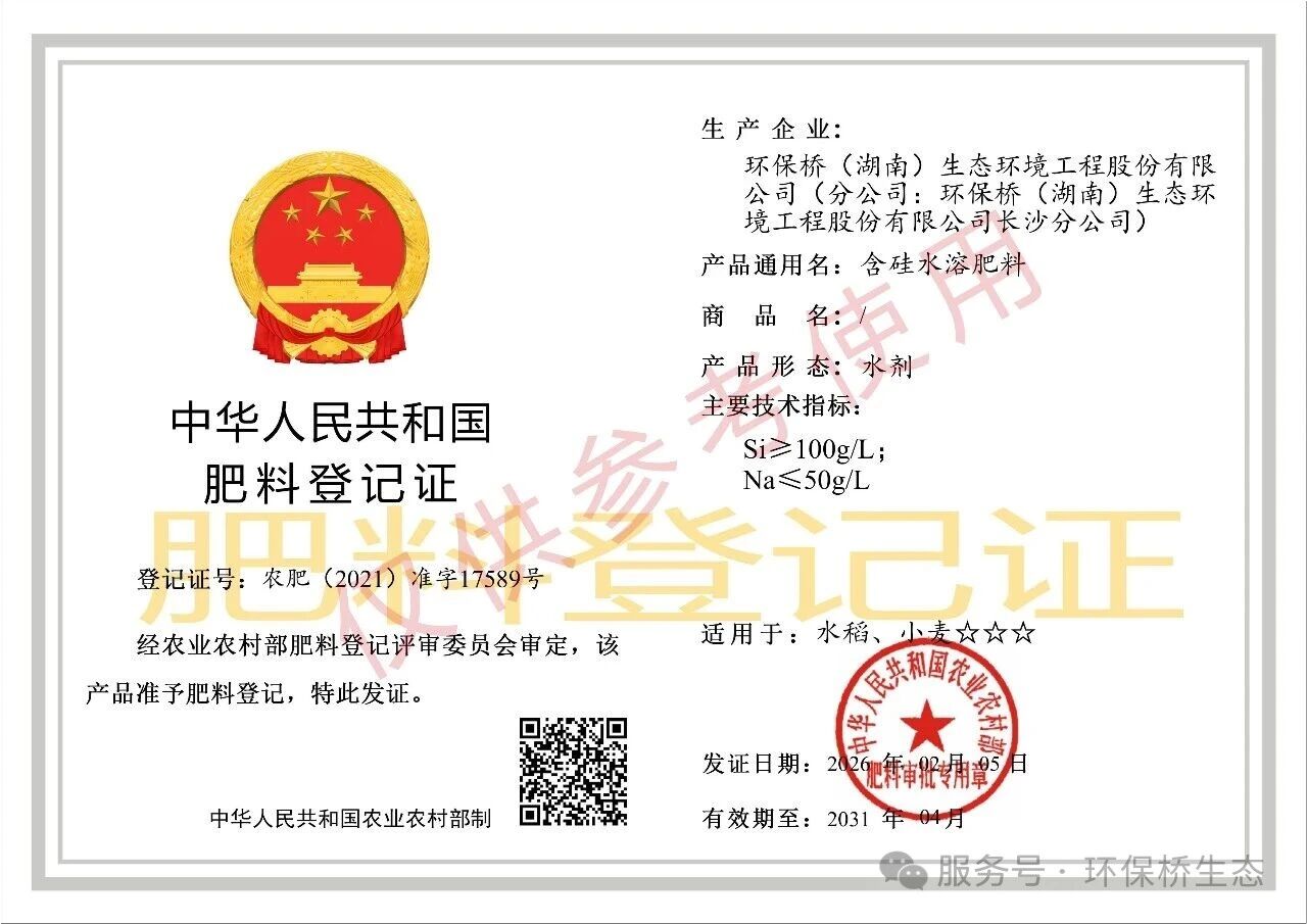 新的肥料登记证的发证日期为2026年2月5日,有效期至2031年4月。产品通用名称由中量元素肥料,变更为含硅水溶肥料。登记证号不变,仍为农肥(2021)准字17589号。