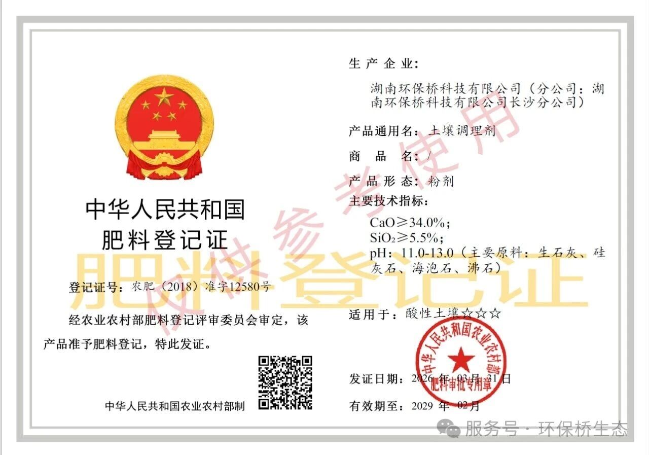 近日,湖南环保桥科技有限公司2本土壤调理剂肥料登记证完成换证。今年元月,环保桥公司名称变更,农业农村部肥料登记证更新工作随即展开。