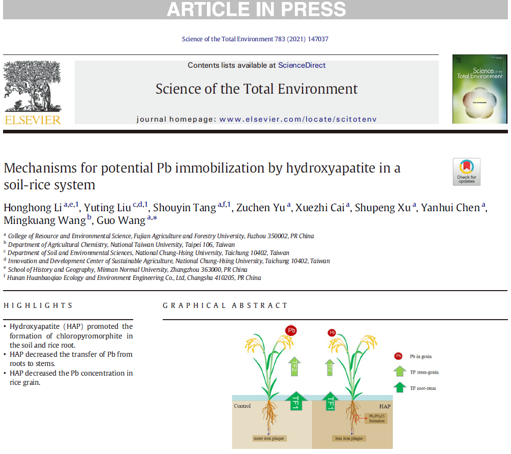 该项研究由环保桥生态与福建农林大学合作完成。相关研究成果以论文“Mechanisms for potential Pb immobilization by hydroxyapatite in a soil-rice system” 为题发表在《Science of the Total Environment》(Ⅰ区,IF=6.551)。环保桥生态技术负责人为该论文共同第一作者。